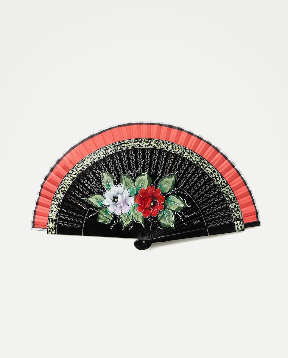 Leque com Flores Pintadas à Mão e em Madeira Trabalhada - Preto