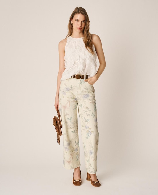 Jeans com Corte a Direito Pelo Tornozelo com Estampado Floral