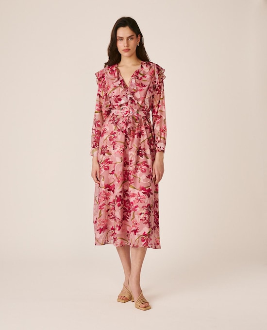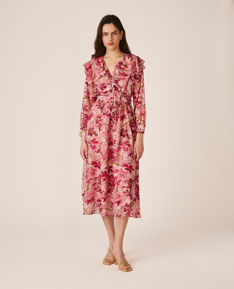 NovoAlma en PenaVestido Curto Fluído Confecionado em Gaze com Estampado Floral e Costas com Folhos na GolaAdicionar