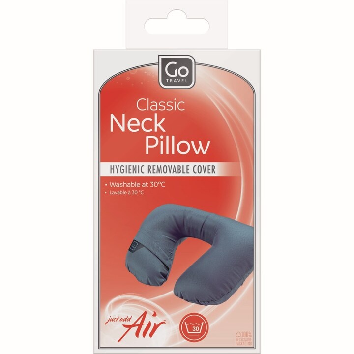 Almofada de pescoço insuflável perfeita para todos os tipos de viagens, especialmente as de curta distância, graças às suas dimensões compactas quando desinflada e embalada.
