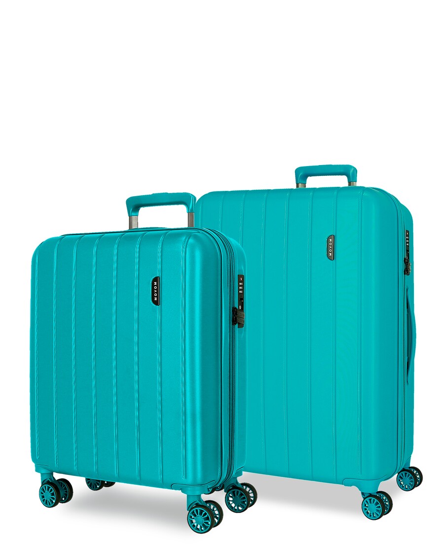 Conjunto de malas composto por uma mala de cabine de 40 x 55 x 20 cm com 38L e 3 kg, e uma mala grande de 45 x 65 x 28 cm de 68L e 3,8 kg. Fabricadas em ABS, um material rígido e leve.