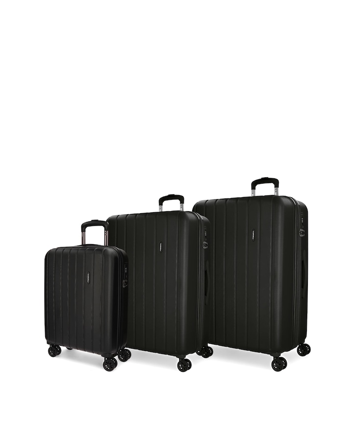 Conjunto de malas composto por uma mala de cabine de 40 x 55 x 20 cm com 38L e 2,9 kg, uma mala média de 45 x 65 x 28 cm de 68L e 3,8 kg, e uma mala grande de 52 x 75 x 32 cm de 109L e 4,9 kg. Fabricadas em ABS, um material rígido e leve.
