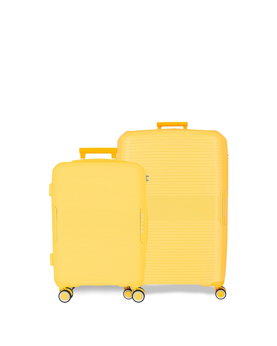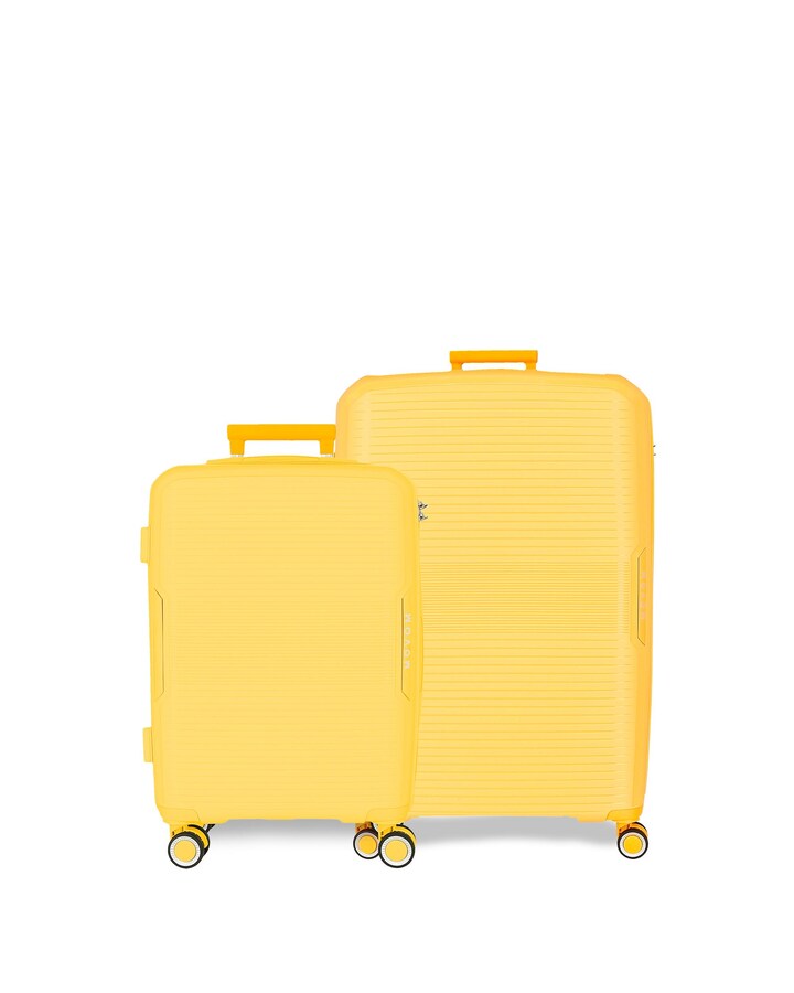 Conjunto de bagagem composto por um trolley de cabine 40 cm x 55 cm x 20 cm com 37L e 2,8 kg, um Trolley médio 46 x 68 x 27 cm com 72L e 3,8 kg. Feito de ABS, um material forte e leve.