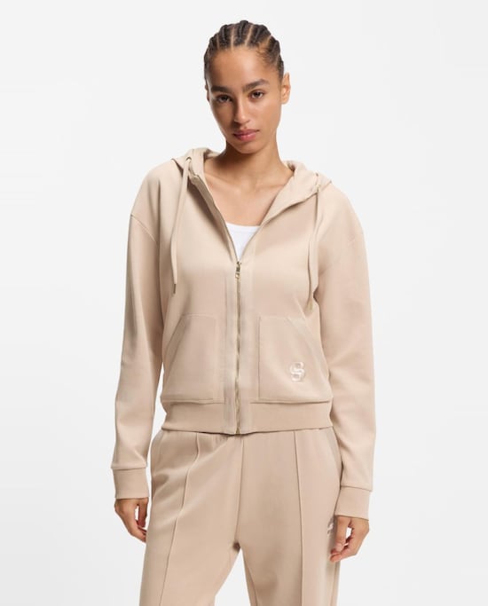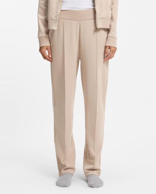 BossCalças em Veludo Suave com Perna Regular - Cru Bainha Elástica. Atacadores de Cetim com Monograma Brilhante. Placa Dourada.Adicionar
