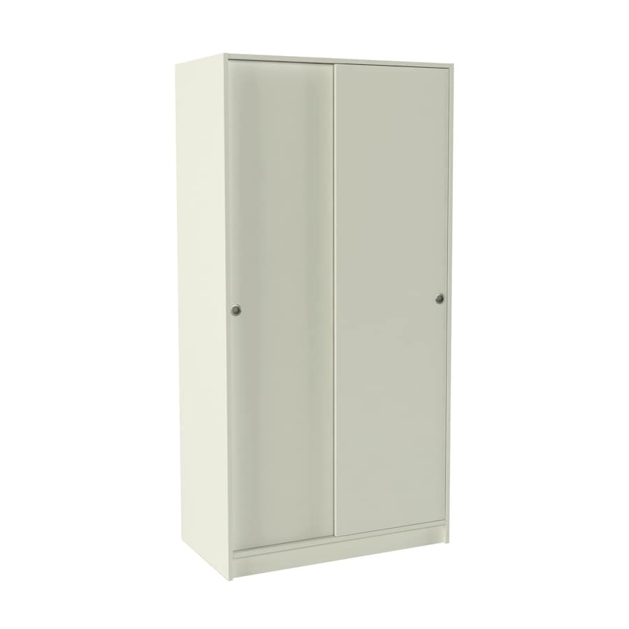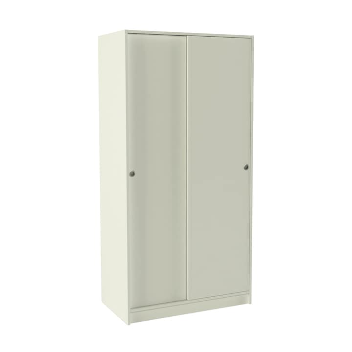 Roupeiro em melamina, com 2 portas de correr com puxadores circulares, e interior com prateleira em mezanino e barra transversal para pendurar cabides.