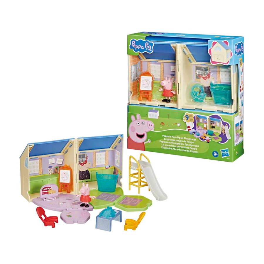O conjunto de jogo A creche portátil da Peppa Pig inclui diferentes áreas de brincadeira, como uma sala de aula e zonas de recreio. Contém sete acessórios: mesa, cadeiras, um cavalete, um cesto e um escorrega. Inclui uma figura articulada da Peppa que pode sentar-se nas cadeiras e deslizar pelo escorrega. O conjunto foi concebido para estimular o desenvolvimento sensorial e a orientação espacial durante a brincadeira.