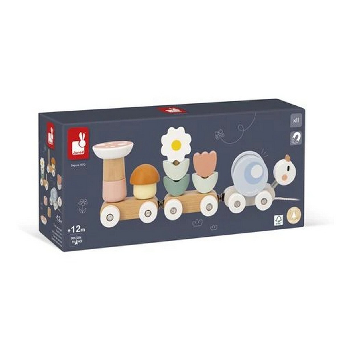 Parta para um passeio pelo campo, descobrindo flores e cogumelos. Comboio em forma de caracol composto por 3 carruagens com 2 flores e 2 cogumelos para montar (10 peças). A concha do caracol é destacável: rola à medida que o comboio avança e transforma-se num chocalho com contas. Um brinquedo ideal para desenvolver habilidades motoras finas em crianças muito pequenas e ajudar os mais velhos a aprender a andar enquanto puxam o comboio com a corda. Brinquedo de aprendizagem em madeira FSC™. Brinquedo pull-along para crianças a partir dos 12 meses.
