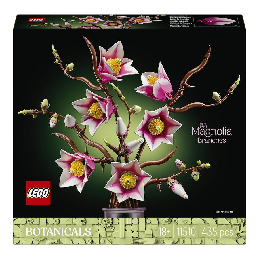 Deixe-se envolver pela natureza e crie uma decoração com flores com o set LEGO® Botanicals Ramos de Magnólia (11510) para adultos. Relaxe enquanto cria o arranjo, que inclui 5 ramos de magnólia altamente detalhados. Trata-se de um dos poucos sets LEGO Botanicals a incluir ramos e as pétalas de magnólia apresentam 2 tons para maior realismo. Existem muitos detalhes divertidos para descobrir, incluindo peças de cupcakes nos carpelos, sapos castanhos nos nós de madeira, ovos nos botões e gelados nas pontas enroladas dos botões. Depois de construídas, as flores LEGO tornam-se numa decoração floral deslumbrante que pode ser combinada com outros sets LEGO Botanicals (vendidos separadamente) para uma exposição ainda maior. Este kit LEGO é um excelente presente de aniversário, do Dia dos Namorados ou do Dia da Mãe para homens, mulheres e fãs da natureza. Está ainda disponível na app LEGO Builder, onde os aspirantes a floristas podem rodar o modelo e acompanhar o progresso. O set contém 435 peças.