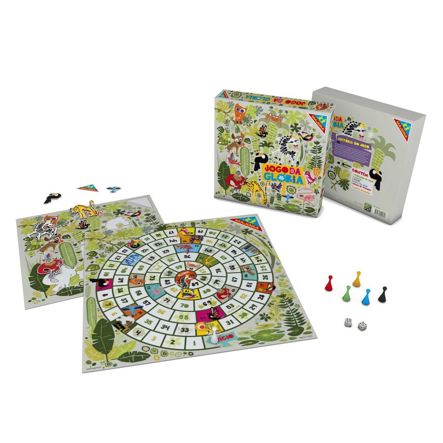 O novo Jogo da Glória é uma autêntica selva, liderada pela zebra Glória! Sentes-te com sorte? É ela quem vai ditar quem avança, recua e quem fica preso nas armadilhas. Será que consegues alcançar a glória? Este jogo contém autocolantes para decorares os teus objetos preferidos.