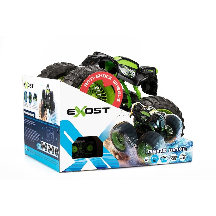 O Exost Rhino Wave é um grande camião com pneus XXL e tecnologia patenteada. Graças à tecnologia patenteada de suspensão integrada nas rodas, o Rhino Wave pode enfrentar qualquer terreno, fazer facilmente rotações de 360 graus e superar qualquer obstáculo! Pode ser usado em todos os tipos de terrenos, inclusive na água, graças às hélices propulsoras localizadas na parte traseira do carro e ao seu chassis resistente à água.