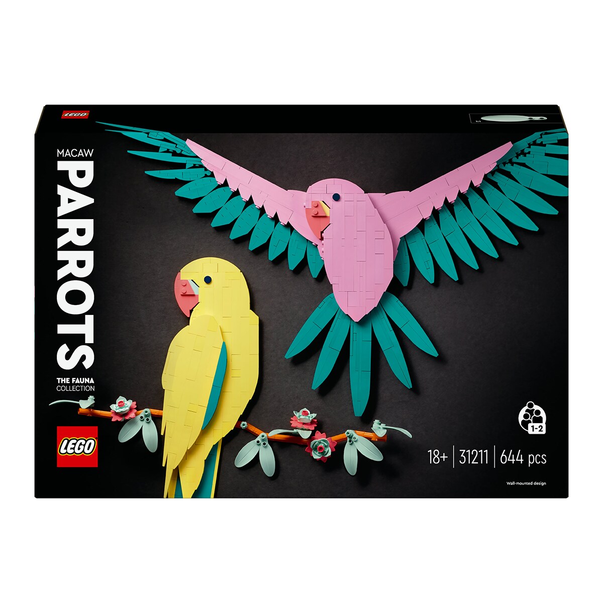 Esta peça de arte dimensional construída com peças apresenta 2 araras exóticas - uma amarela num ramo decorado com flores e uma rosa a voar com as asas abertas. O presente de decoração para a casa inclui 2 instruções de construção para que os fãs da LEGO adultos possam criar os papagaios em conjunto numa experiência social descontraída.