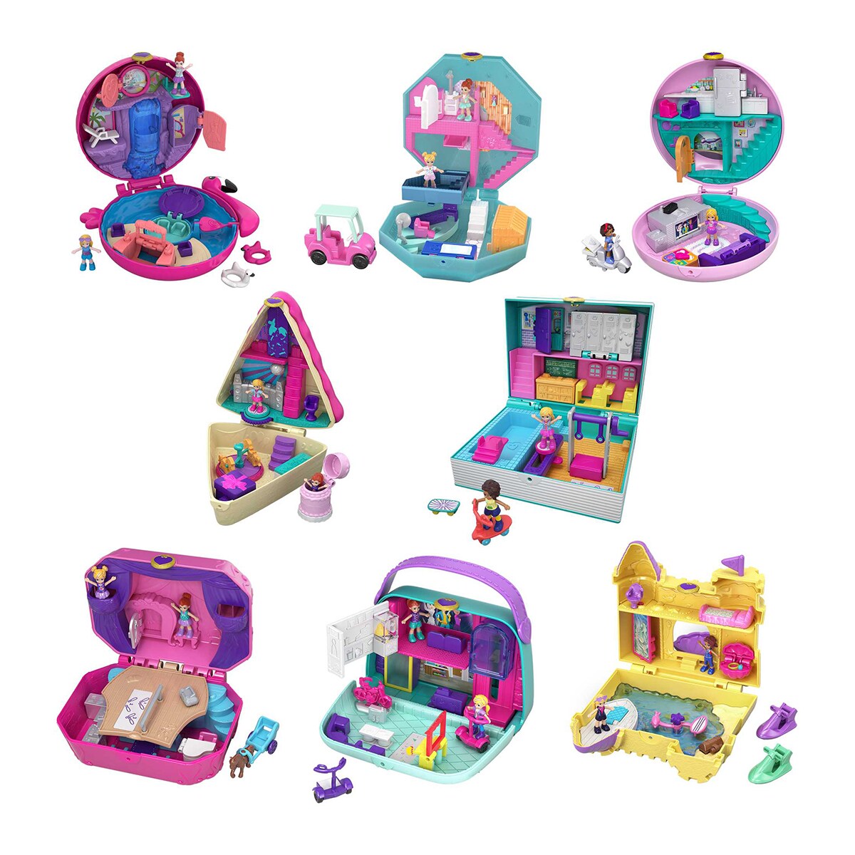 O estojo Polly Pocket inclui mini bonecas e um conjunto de jogo com acessórios temáticos. Cada cofre abre-se para revelar um pequeno mundo com pormenores e elementos interativos. Os cofres são portáteis e incluem micro bonecas, bem como acessórios que permitem criar diversas cenas e situações. Comercializam-se modelos sortidos vendidos em separado.