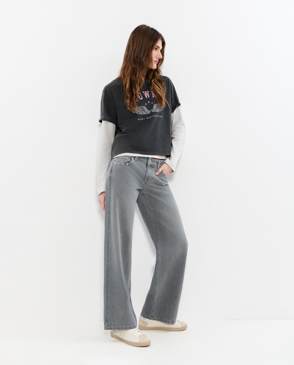 Jeans Largo com Asas e Tachas