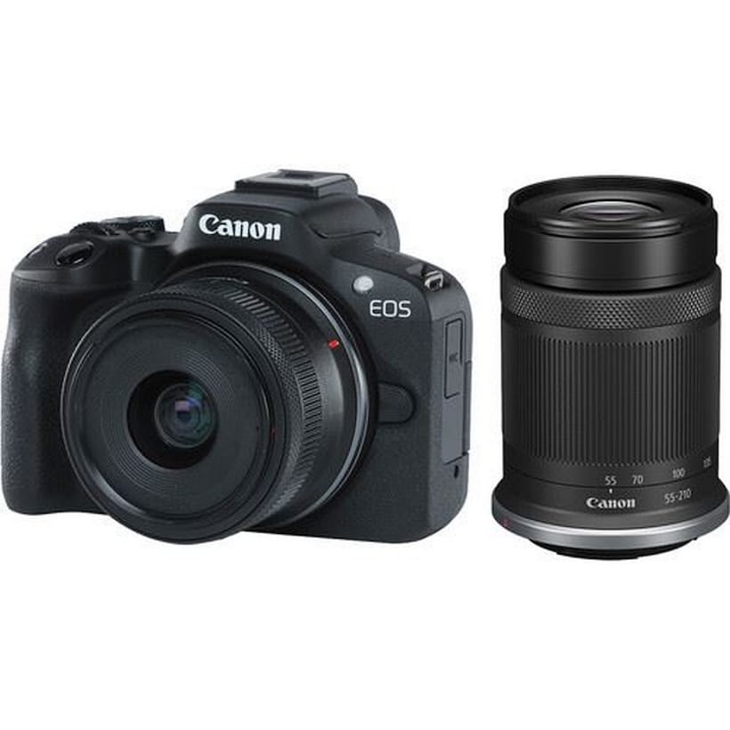 CanonCâmara Evil Canon EOS R50BK + Objectiva RFS 18-45 mm F4.5-6.3 IS STM + RF-S 55-210 F5-7.1 IS STM - PretoAdicionar