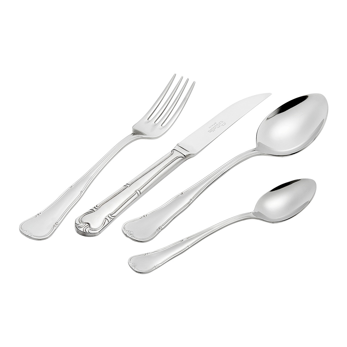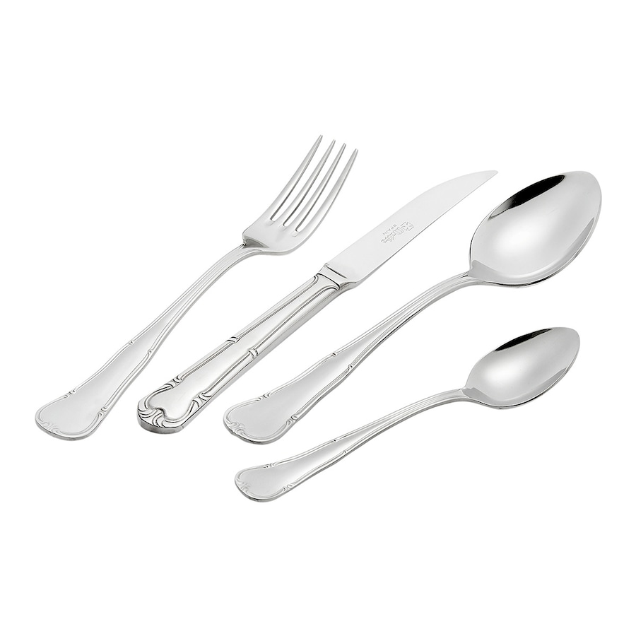 - 12 Colheres de mesa12 Garfos de mesa12 Facas de carne12 Facas de peixe12 Garfos de peixe12 Colheres de café12 Garfos lunch12 Facas lunch monoblock12 Colheres de café1 Colher grande de vegetais1 Garfo de legumes1 Faca de servir peixe1 Garfo de servir peixe1 Concha de sopa