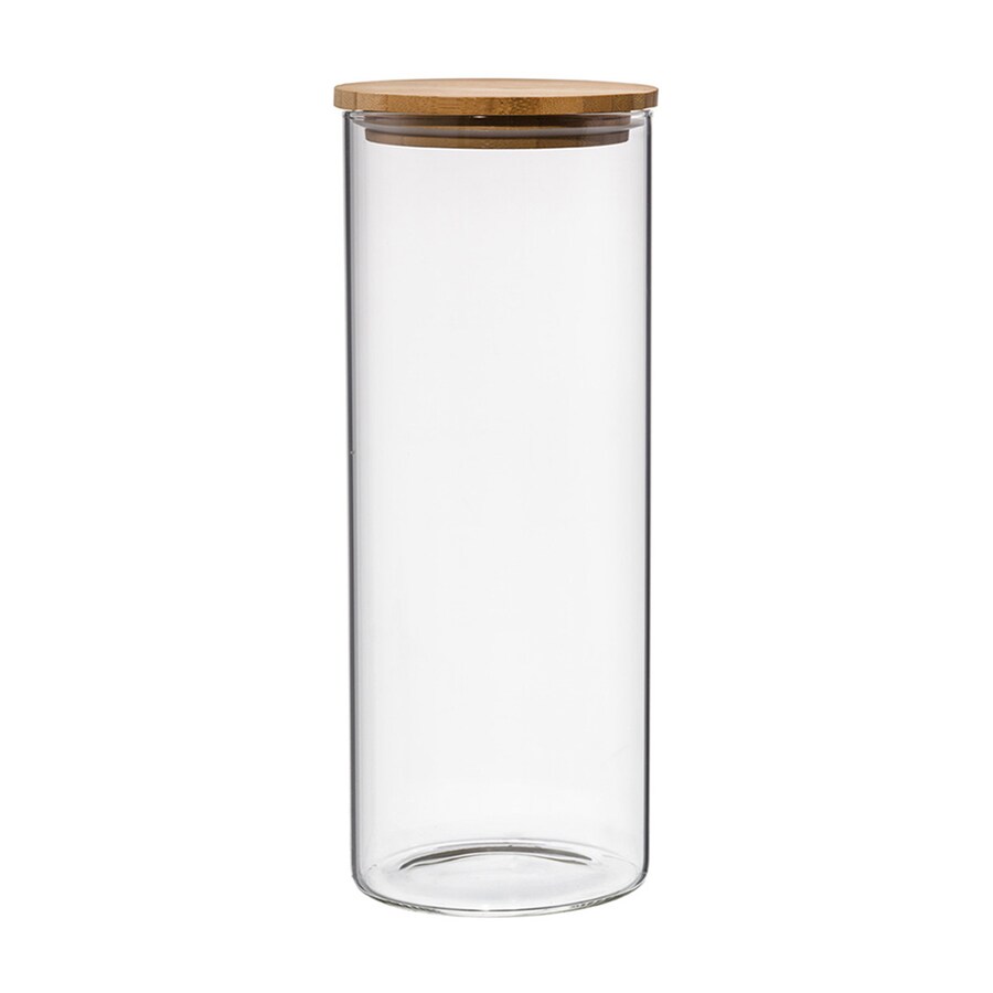 Frasco de cozinha em borossilicato com tampa de madeira de encaixe, concebido para armazenar ingredientes de forma organizada e mantê-los em condições higiénicas.