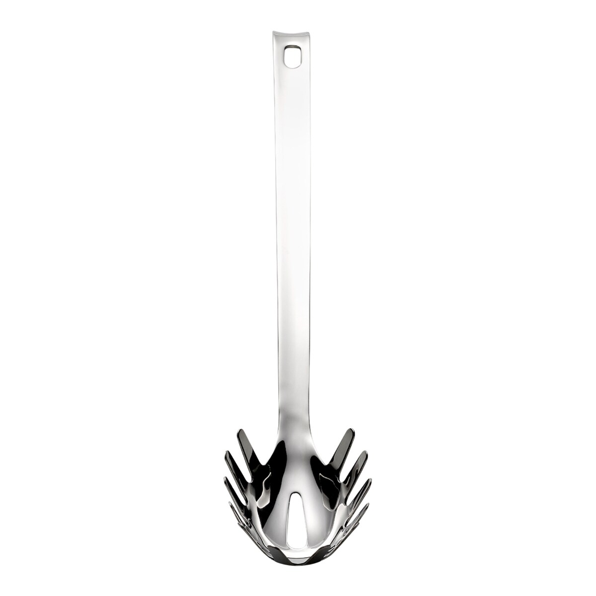 Colher especial para massa fabricada em aço inoxidável, concebida para misturar e servir pratos de massa de forma eficiente e resistente.
