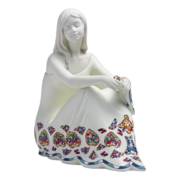 Figura decorativa feita à mão que representa uma mulher em atitude de descanso e harmonia. Faz parte de uma coleção que expressa sentimentos através da figura feminina, destacando os detalhes do vestuário e das formas do corpo. Esta peça foi concebida para criar um ambiente acolhedor e transmitir valores universais como a paz, a liberdade e a esperança.