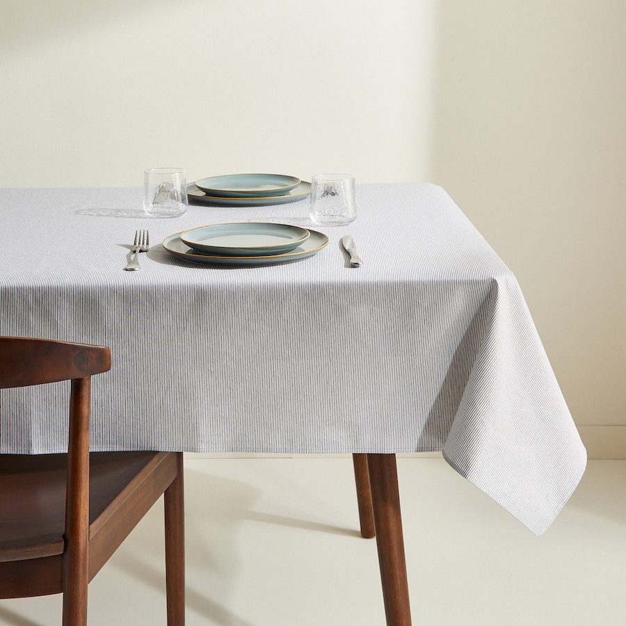 Toalha de mesa resinada com estampado às riscas, que pode encontrar em vários tons.
