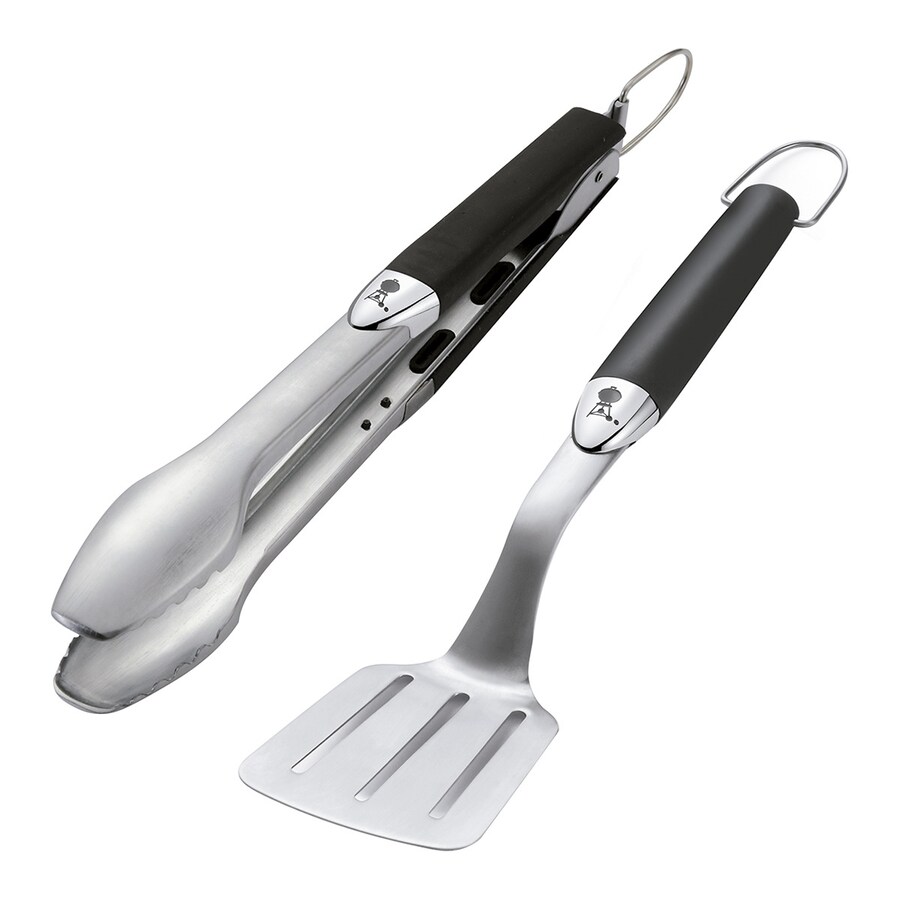 Conjunto de acessórios para churrasco que inclui uma pinça e uma espátula, concebidas para segurar os alimentos em segurança através de um cabo cómodo e ergonómico.