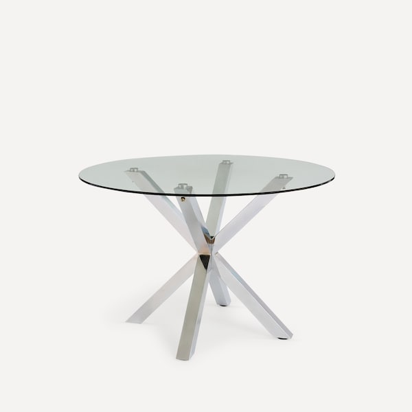 As suas pernas originais em forma de X são feitas de aço cromado brilhante e resistente e o seu tampo é feito de vidro temperado transparente. Com capacidade para quatro pessoas, esta é uma peça que confere singularidade a qualquer espaço.