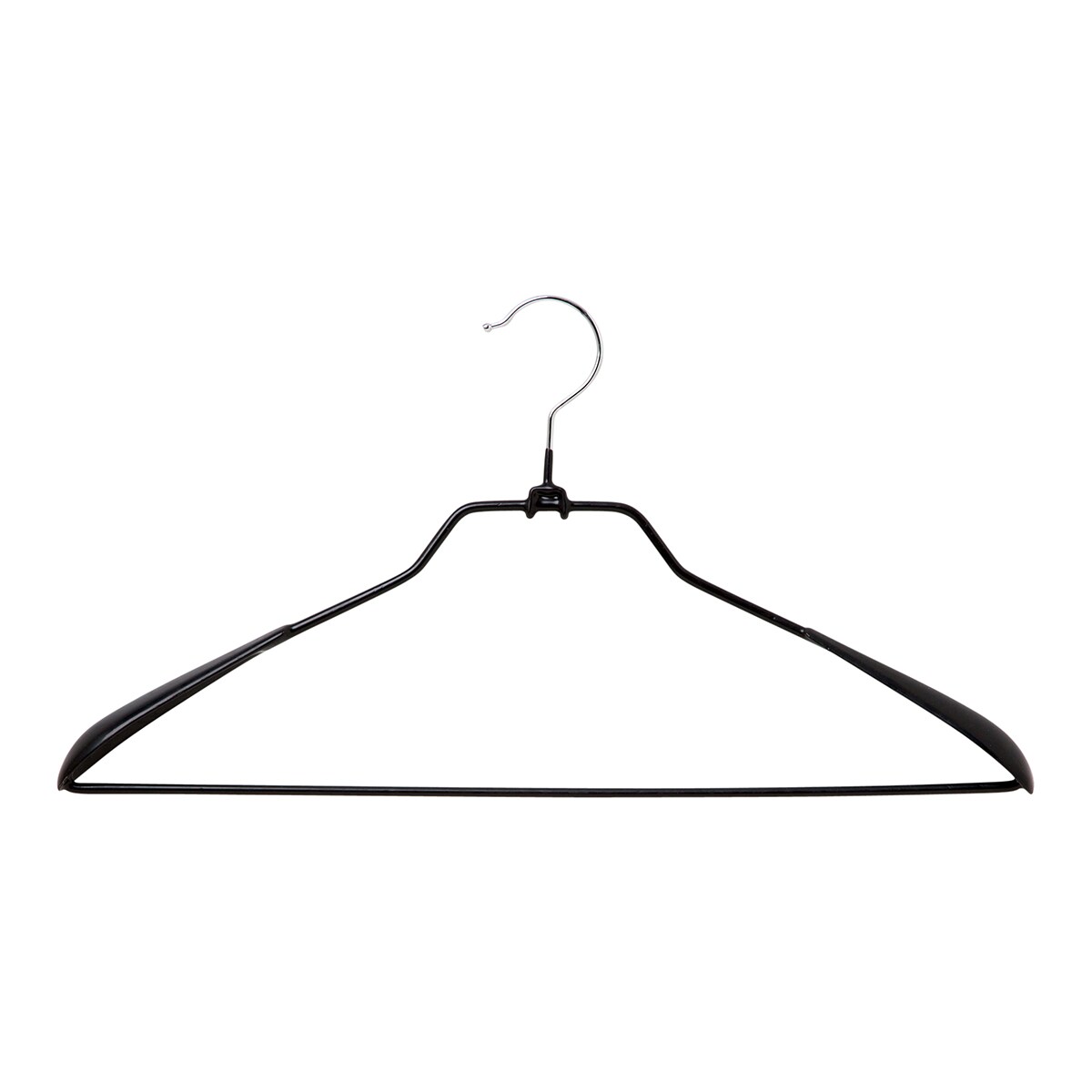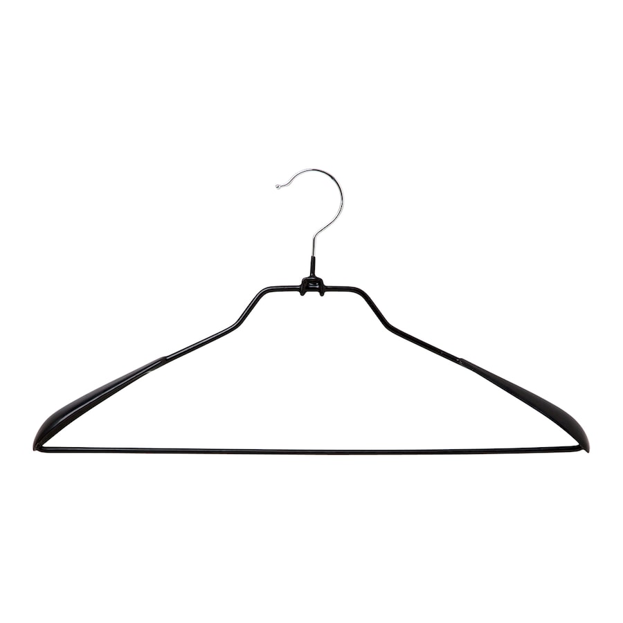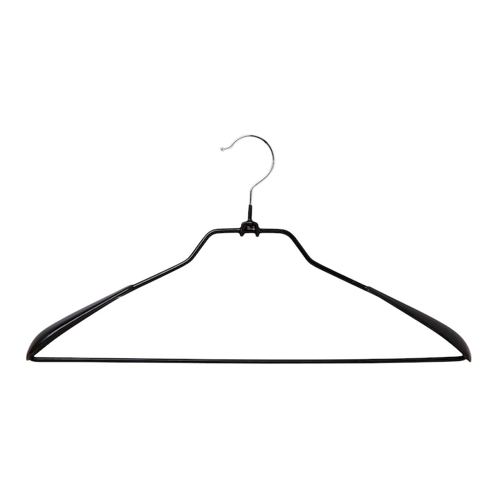 Cabide de metal concebido para manter a forma dos casacos através de ombreiras integradas, equipado com barra antiderrapante para pendurar calças.