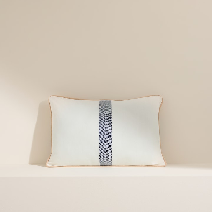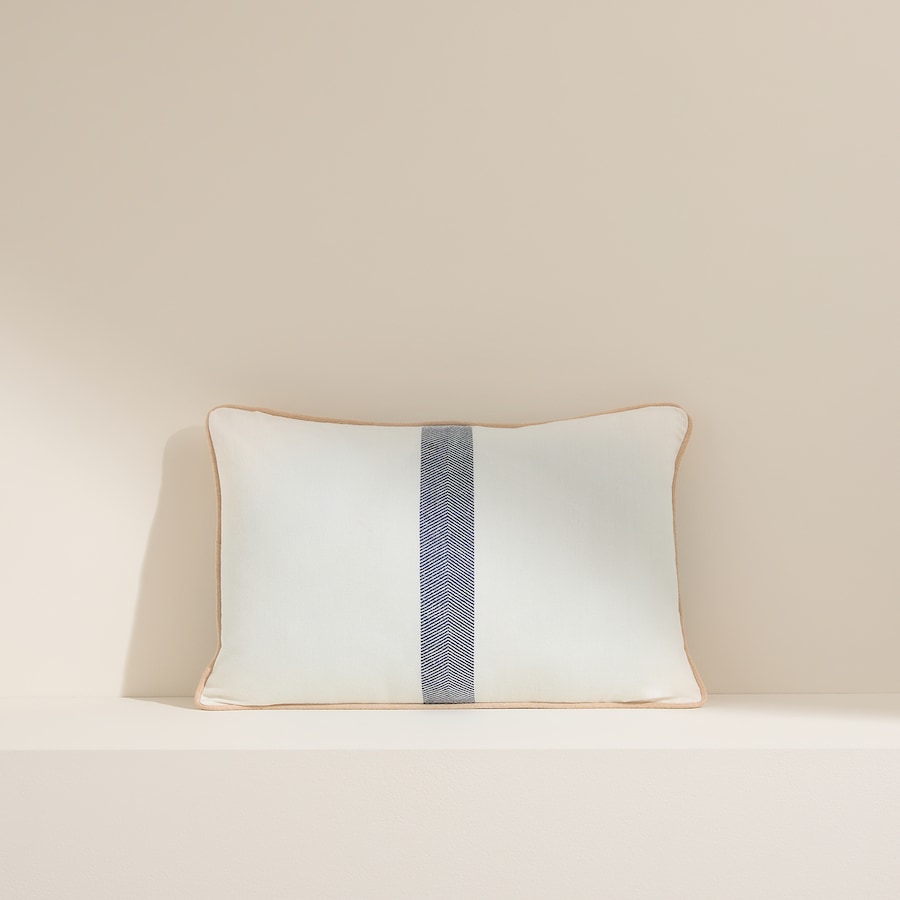 Almofada rectangular com risca contrastante, disponível em diferentes tonalidades.