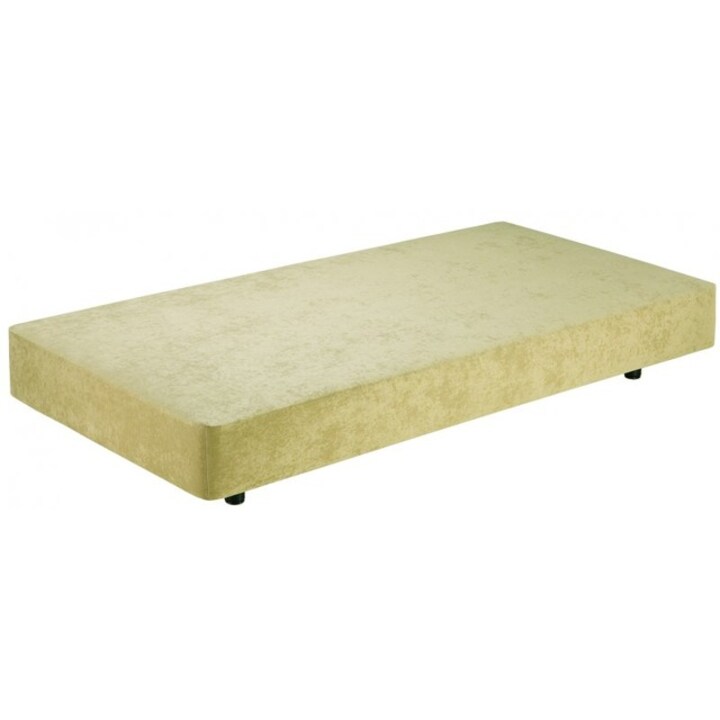 Estrado: Aglomerado perfurado apoiado em travessões. Tampo em tecido 3D ao centro para as bases forradas em semipele.