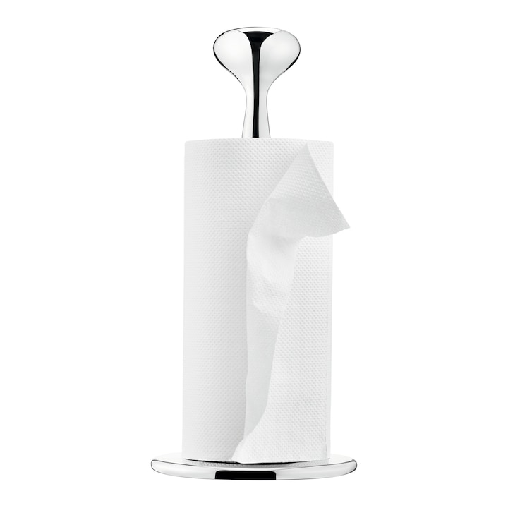 Suporte para rolo de cozinha concebido para utilização na cozinha e na mesa, fabricado em aço inoxidável, com um design moderno e funcional que facilita o acesso e a arrumação do papel de cozinha.