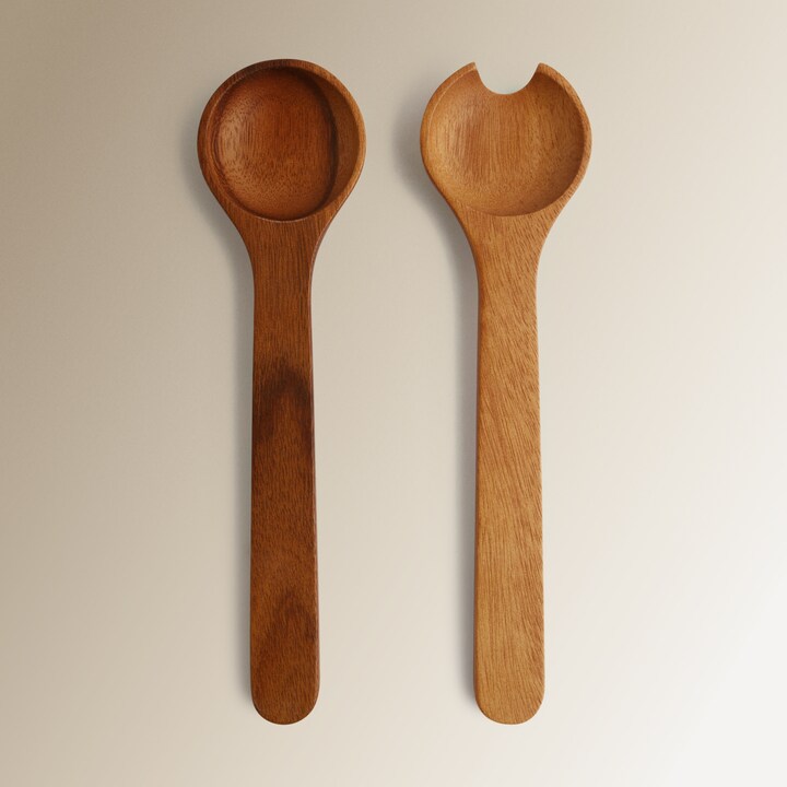 Conjunto de garfo e colher para servir salada, fabricados em madeira de acácia com acabamento rústico, concebidos para facilitar o serviço de saladas e outras receitas, acrescentando funcionalidade à mesa com um design elegante e linhas arredondadas.