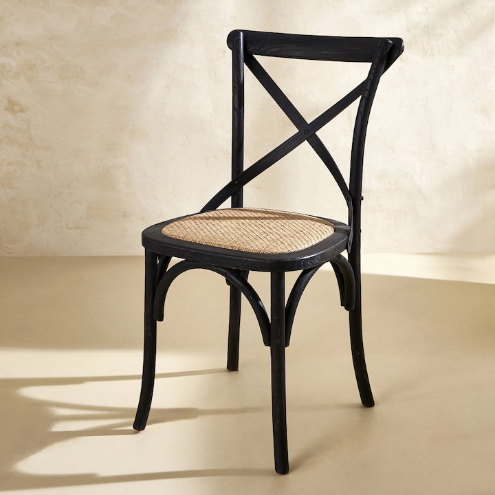 Cadeira em madeira de bétula, com assento estofado em rotim trançado e encosto. Um desenho francês clássico com uma subtil reviravolta moderna, que combina linhas rectas com formas curvas.