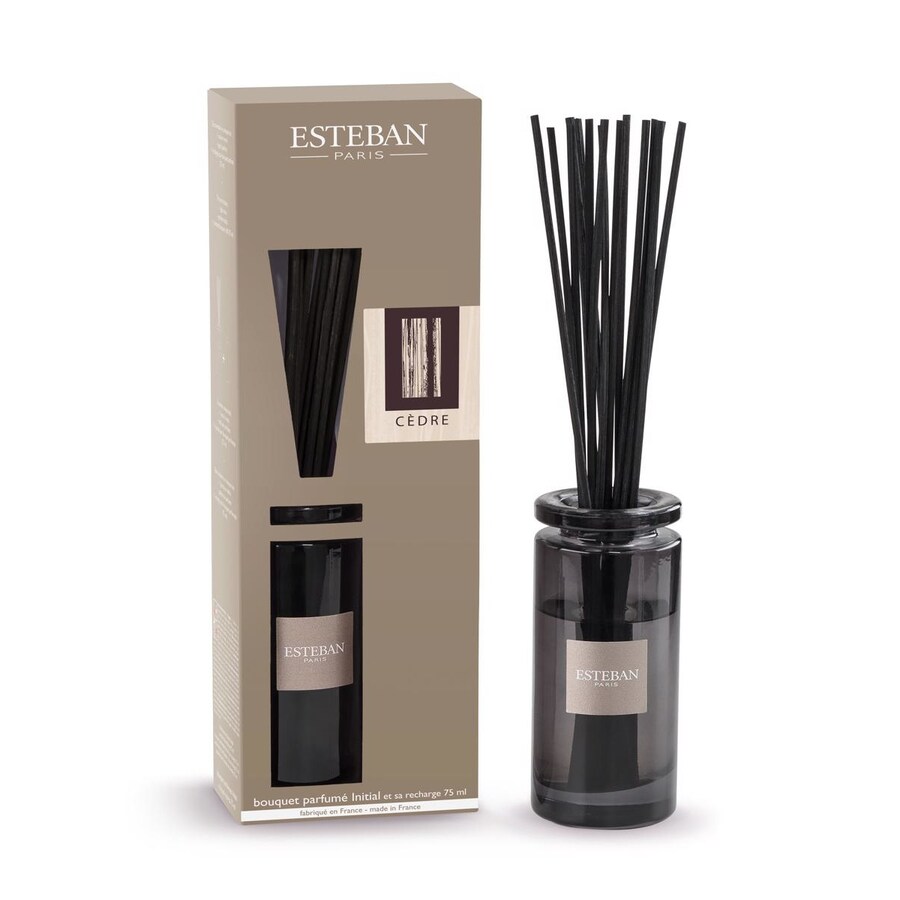 Difusor de Aroma Esteban «Initial» de Perfume CEDRO com recarga 75 ml. Este Perfume Cedro é um amadeirado, fresco . Nota de Cabeça: Toranja e Noz Moscada; Nota de Coração: Cedro, Cravo da India e Patchouli e Nota de Fundo: Sândalo, Bálsamos e Baunilha.