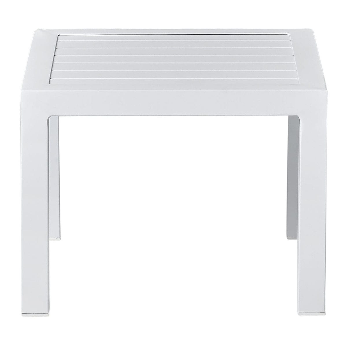 Mesa auxiliar em alumínio, material leve, resistente e de fácil manutenção. O tampo em forma de lâminas separadas permite que, em caso de chuva, a água não seja armazenada na superfície, o que também contribui para a durabilidade do produto.