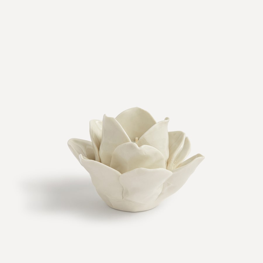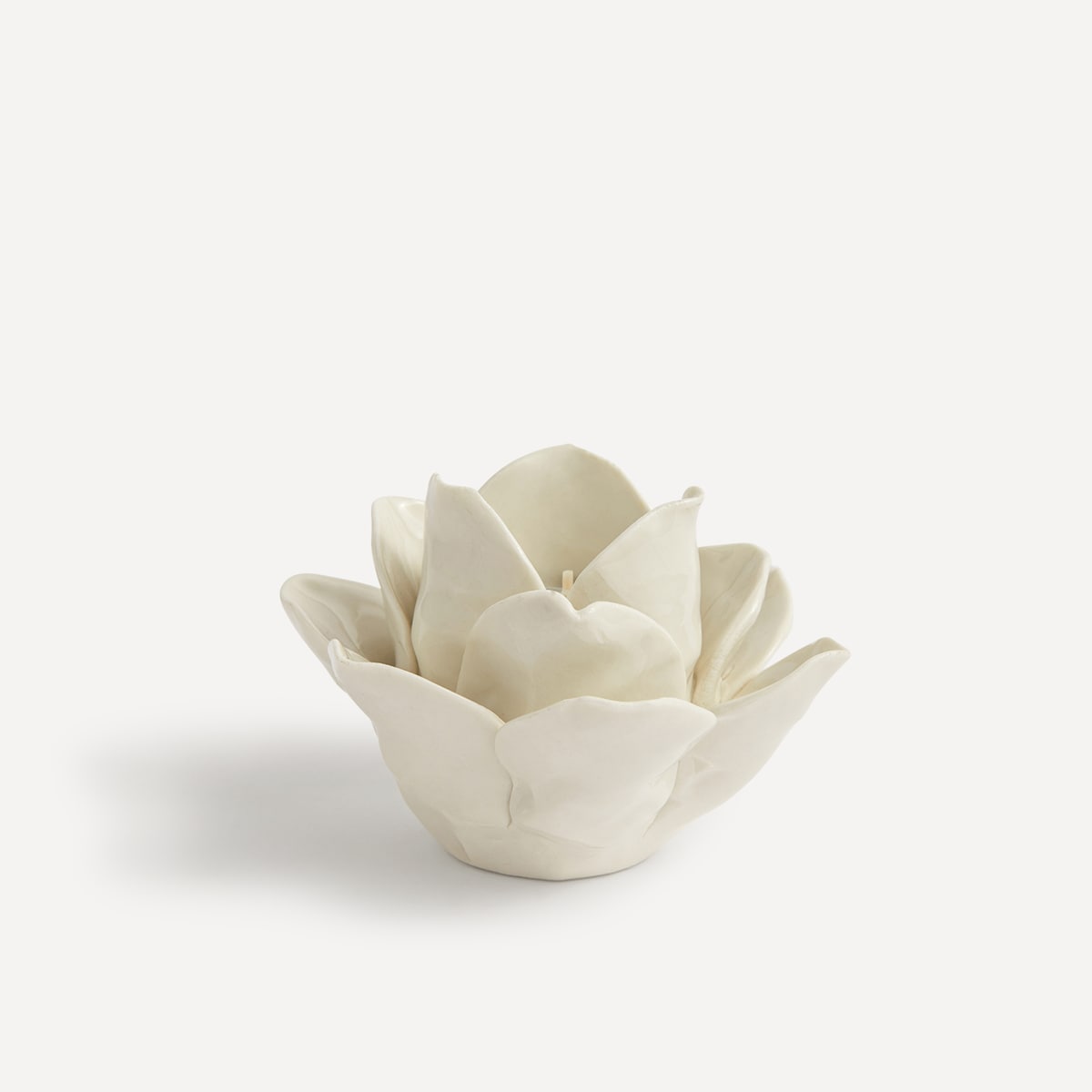 Porta-velas para tealight fabricado em cerâmica esculpida e polida à mão, em forma de flor aquática. Foi concebido para colocar uma vela pequena e proporcionar iluminação ambiente em diferentes espaços.