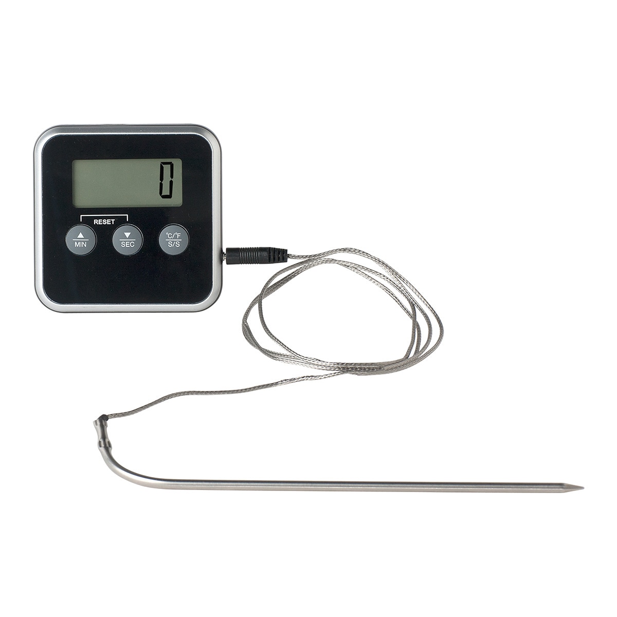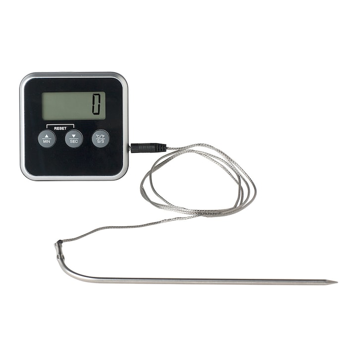 Termómetro digital de cozinha que permite medir a temperatura dos alimentos durante a cozedura, ajudando a obter o ponto de cozedura adequado em carnes, assados e outras preparações. Inclui ecrã digital para apresentar a temperatura em graus Celsius e Fahrenheit, função de alarme para indicar quando é atingida a temperatura definida, íman para fixação em superfícies metálicas e mola para o colocar sobre a bancada.