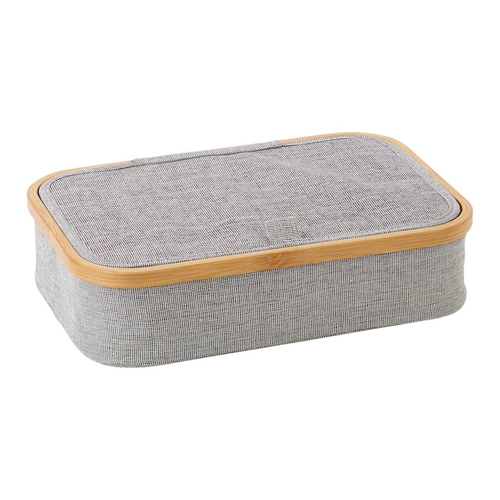 Caixa organizadora com tampa e quatro compartimentos, concebida para guardar e organizar acessórios. É fabricada em tecido com rebordo em madeira de bambu, permitindo manter os objetos arrumados de forma prática.