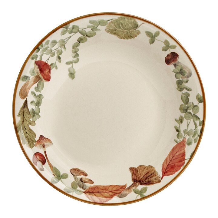 Prato fundo em faiança com decoração de folhas e cogumelos. Concebido para utilização à mesa, pode ser combinado com outras peças da mesma coleção para criar um conjunto coordenado.