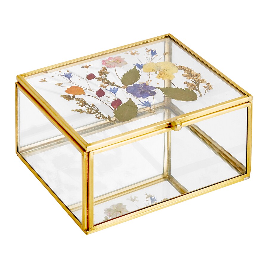 Caixa decorativa em vidro com arestas em latão dourado. A tampa inclui flores secas naturais incrustadas. Pode ser utilizada para guardar diversos objetos, como joias ou rebuçados, e o seu design acrescenta estilo à decoração. Disponível em dois tamanhos e pode ser combinada com uma caixa circular do mesmo modelo.