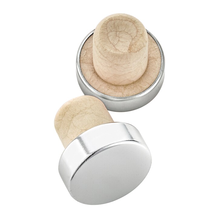 Conjunto composto por dois rolhas fabricadas em cortiça com topo de plástico, concebidas para fechar garrafas e conservar o vinho em condições adequadas durante um período prolongado.