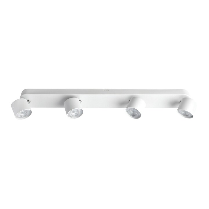 Tira com quatro projectores LED, estrutura de alumínio e acabamento branco. Tem um estilo contemporâneo que o ajudará a criar uma atmosfera muito moderna.