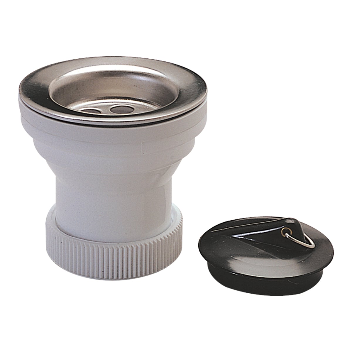 Blister de válvula de lava-louça 40mm em polipropileno branco e aço inoxidável.