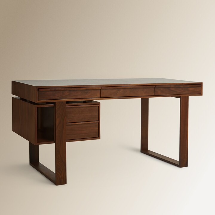 Secretária de linhas direitas, fabricada em chapa de nogueira. Inclui um módulo de gavetas para facilitar a arrumação na zona de estudo ou trabalho, adequada para integrar em salas amplas ou escritórios.