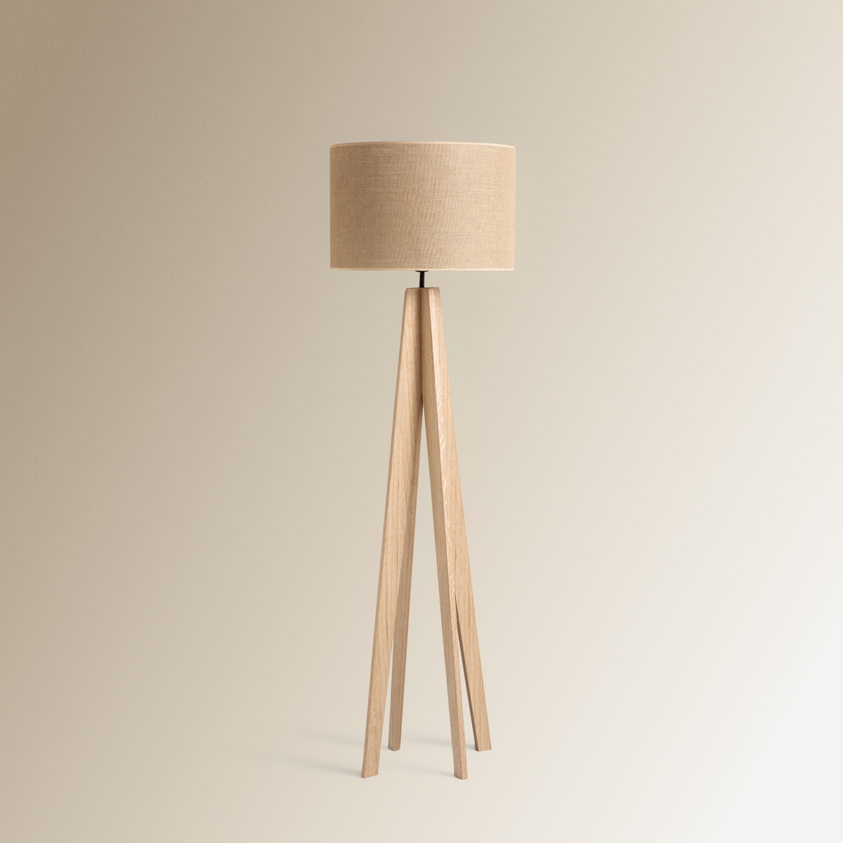 Candeeiro de chão com estrutura de madeira em forma de tripé e abajur têxtil. Compatível com lâmpadas para casquilho grosso E27. Lâmpada não incluída. Se gosta de harmonia decorativa, pode combiná-la com o candeeiro de mesa da mesma série.