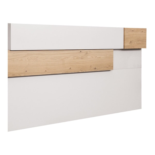 Cabeceira dupla em folha de carvalho que combina o acabamento natural com áreas lacadas. Incorpora luz para facilitar momentos como a leitura.