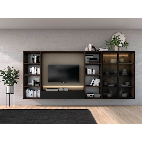 Móvel de sala de estar com área de TV, gaveta de arrumação, duas prateleiras e vitrina. É feito em laminado natural de nogueira, com áreas lacadas em diferentes tons, alumínio anodizado preto e vidro temperado para as duas portas articuladas da vitrina.