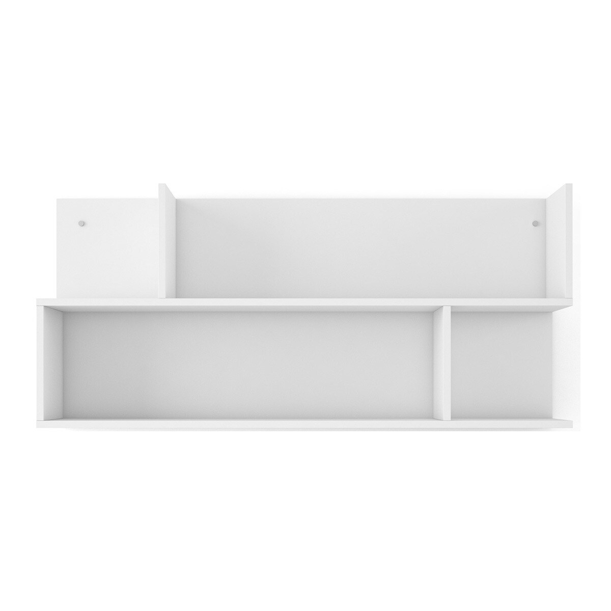 Estante de parede duplo com vários divisores que criam múltiplos compartimentos e um painel traseiro decorativo. É fabricado num material resistente que garante durabilidade. Este módulo oferece espaço adicional para a organização de objetos, combinando funcionalidade com um design simples e minimalista, adequado a diferentes ambientes.