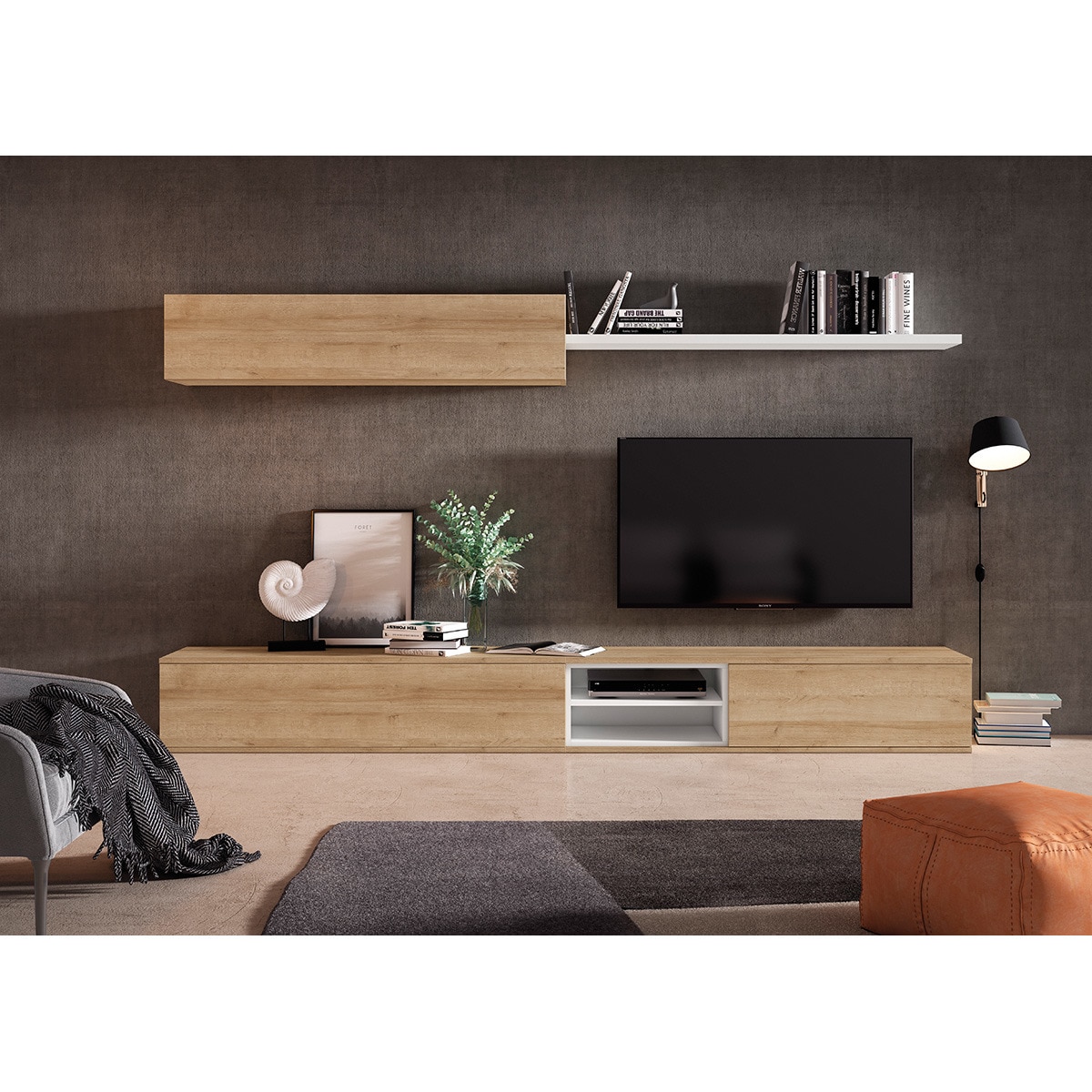 Móvel de sala de estar de linhas simples, com um design moderno, fresco e jovem. É feito de Beladur, um material de alta qualidade e muito resistente. Combina diferentes módulos e possibilidades de armazenamento e arranjo, oferecendo-lhe uma grande capacidade de arrumação para tudo o que deseja.