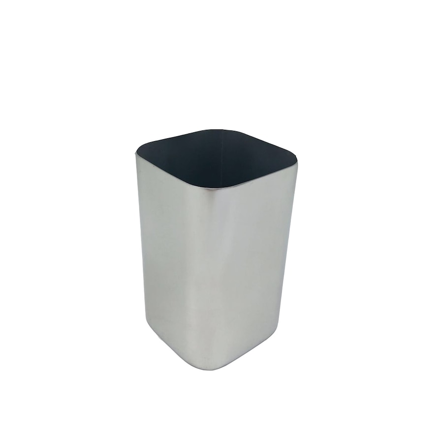 Copo porta-escovas em aço inoxidável com acabamento brilhante. É uma peça leve. O aço inoxidável é um material forte e durável.
