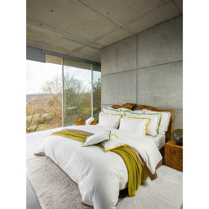 HELLA by Celso de Lemos é uma coleção de roupa de cama em percal branco com um rebordo colorido acetinado a contrastar.