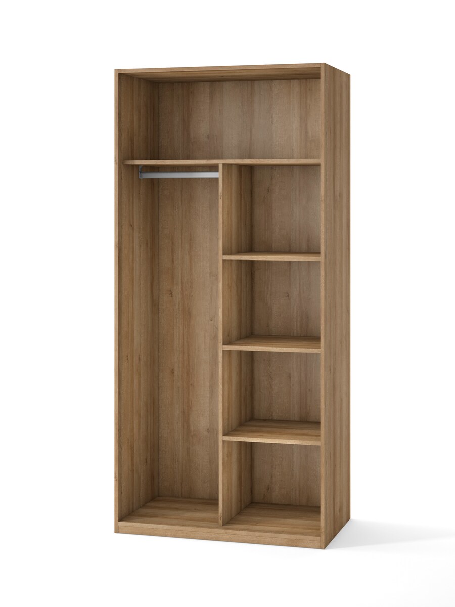 Roupeiro para quarto juvenil com duas portas de abrir, fabricado em beladur, um material duradouro. No interior inclui uma prateleira e um divisor para organizar a roupa de diferentes formas. Faz parte de uma linha de mobiliário juvenil que permite combinar diferentes peças para criar um quarto funcional, com múltiplas opções de arrumação e organização, caracterizado por linhas simples e depuradas.